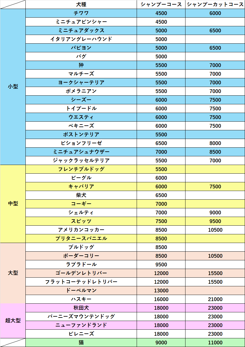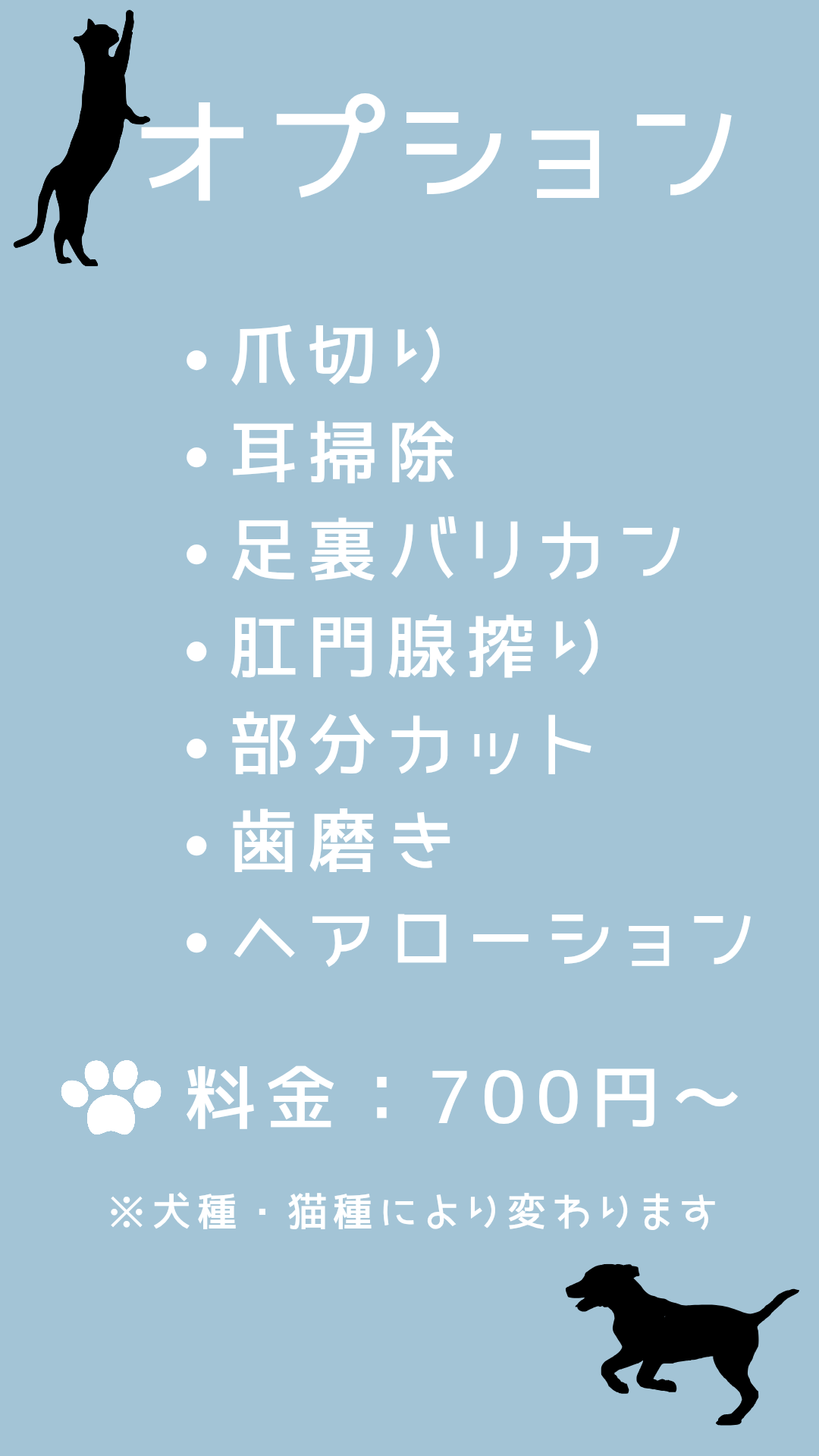 ・サイズ、毛のもつれ具合、毛の長さ、保定が必要な場合等、金額が異なる場合がございます