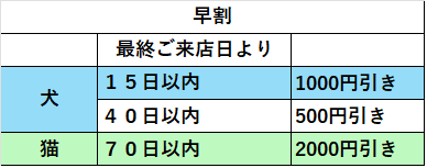 ・猫と犬が同じ部屋に居ることがないように予約をずらして頂いておりますので、ご協力をお願いいたします